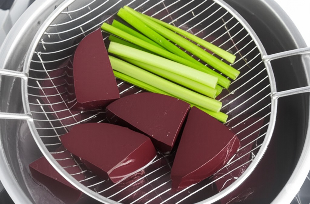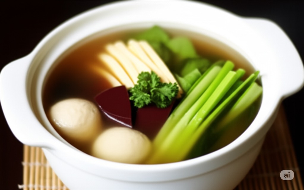 取鸡血、4g 蛋皮、4g 青菜烫制 10 秒后放入汤盅,